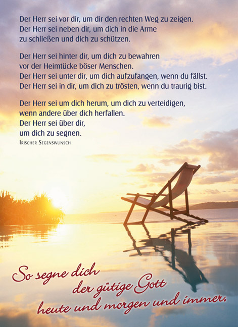 Der Herr sei vor dir, um dir den rechten Weg zu zeigen. Der Herr sei neben dir, um dich in die Arme zu schließen und dich zu schützen. Der Herr sei hinter dir, um dich zu bewahren vor der Heimtücke böser Menschen. Der Herr sei unter dir, um dich aufzufangen, wenn du fällst. Der Herr sei in dir, um dich zu trösten, wenn du traurig bist. Der Herr sei um dich herum, um dich zu verteidigen, wenn andere über dich herfallen. Der Herr sei über dir, um dich zu segnen.