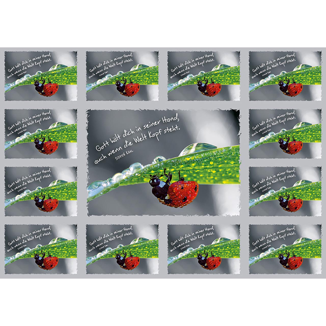 Auf jeder Aufkleber-Grußkarte befinden sich 13 Aufkleber (1 größerer und 12 kleine). Die Motive sind auf besonders stabilem glänzenden Aufkleberkarton gedruckt.