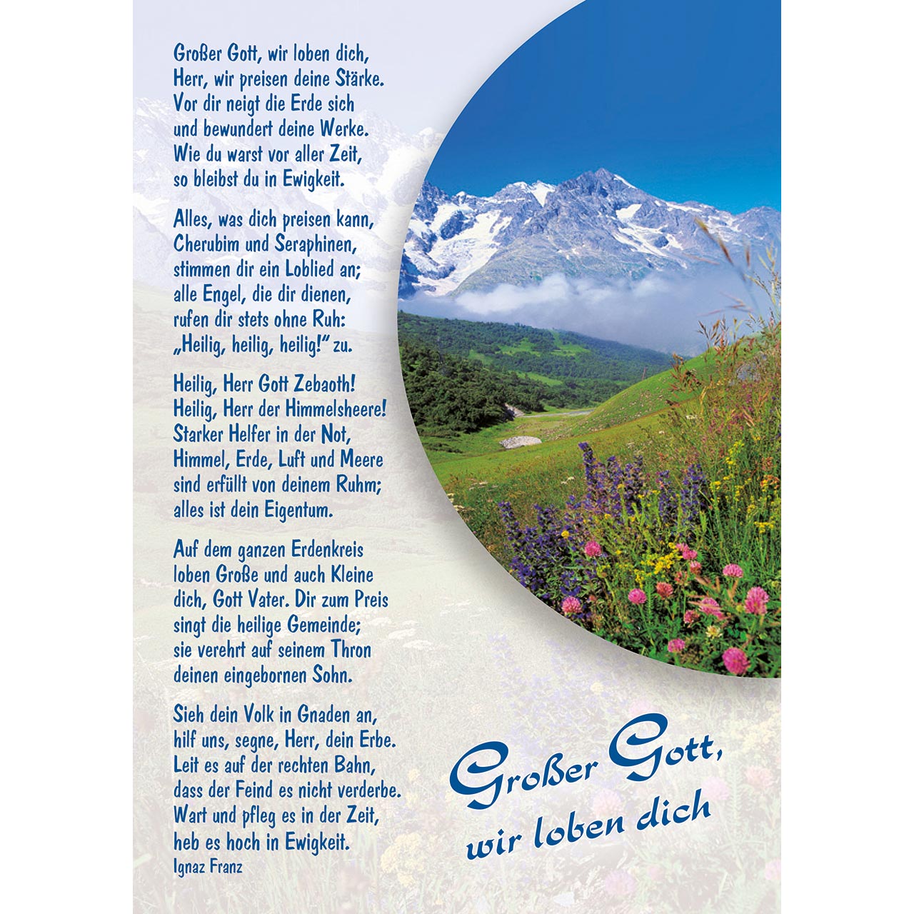 Großer Gott, wir loben dich, Herr, wir preisen deine Stärke. Vor dir neigt die Erde sich und bewundert deine Werke. Wie du warst vor aller Zeit, so bleibst du in Ewigkeit.