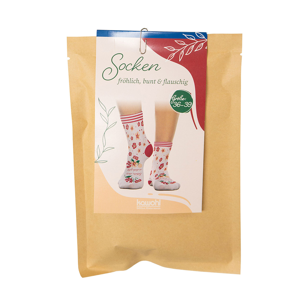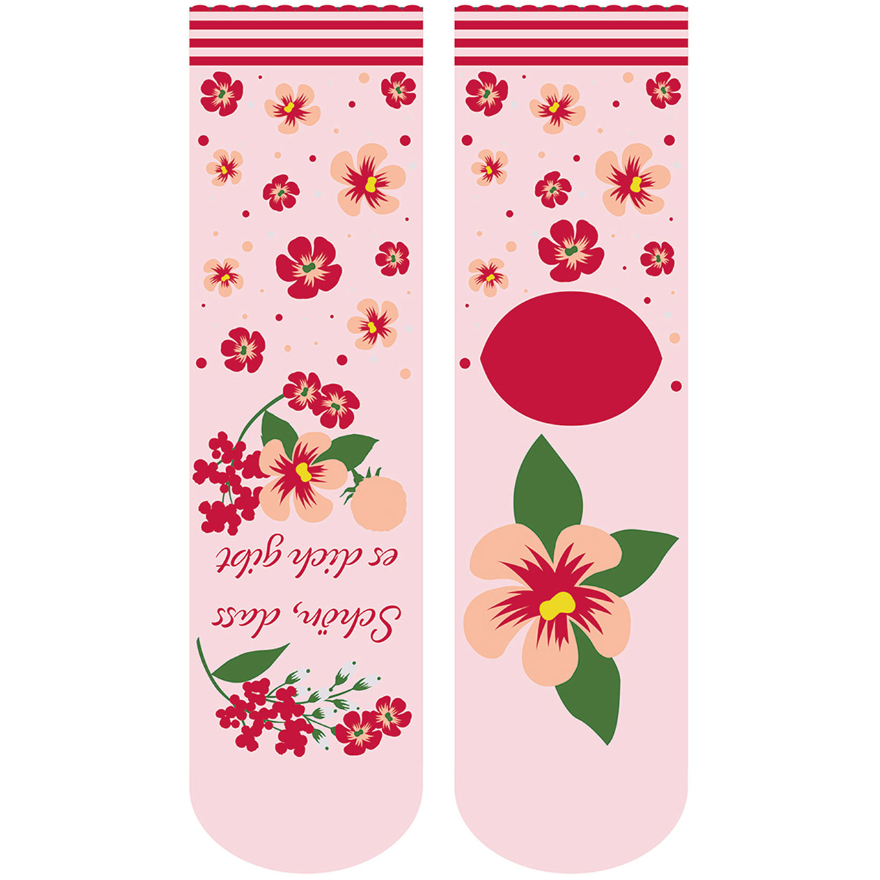 Gemütliche, farbenfrohe Socken mit wertschätzenden Worten und schönem Blümchen-Motiv.