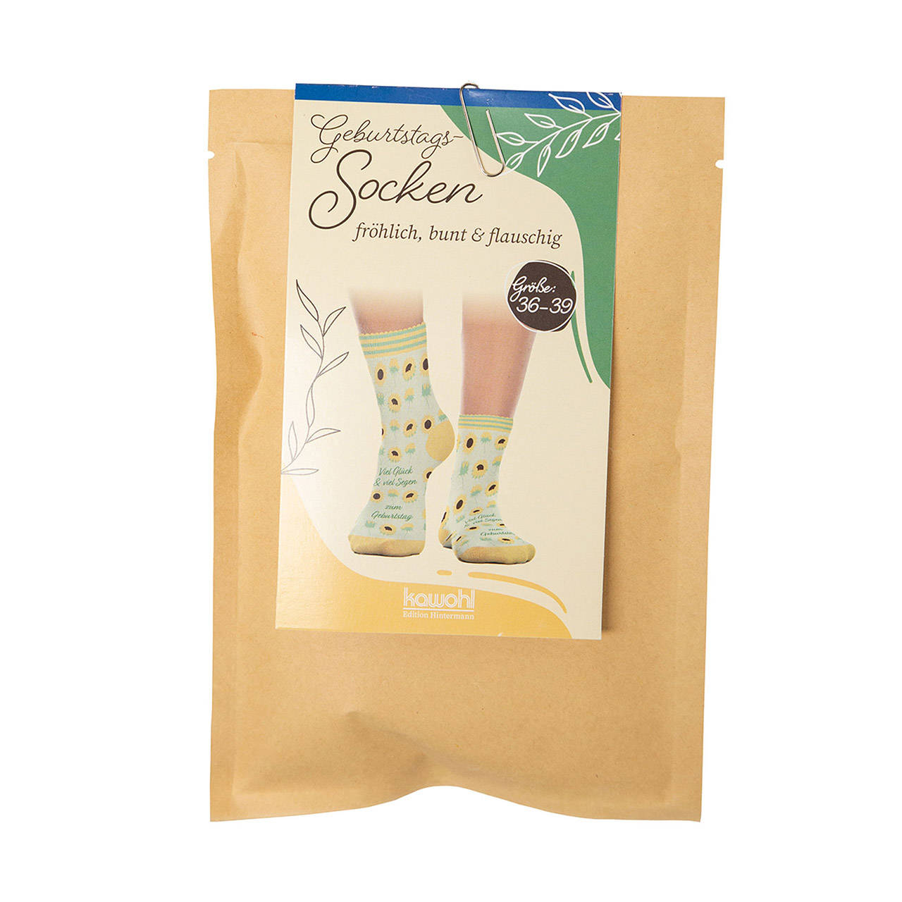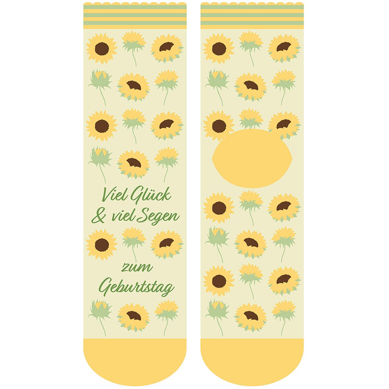 Gemütliche, farbenfrohe Socken mit Geburtstagswunsch und schönem Sonnenblumen-Motiv.